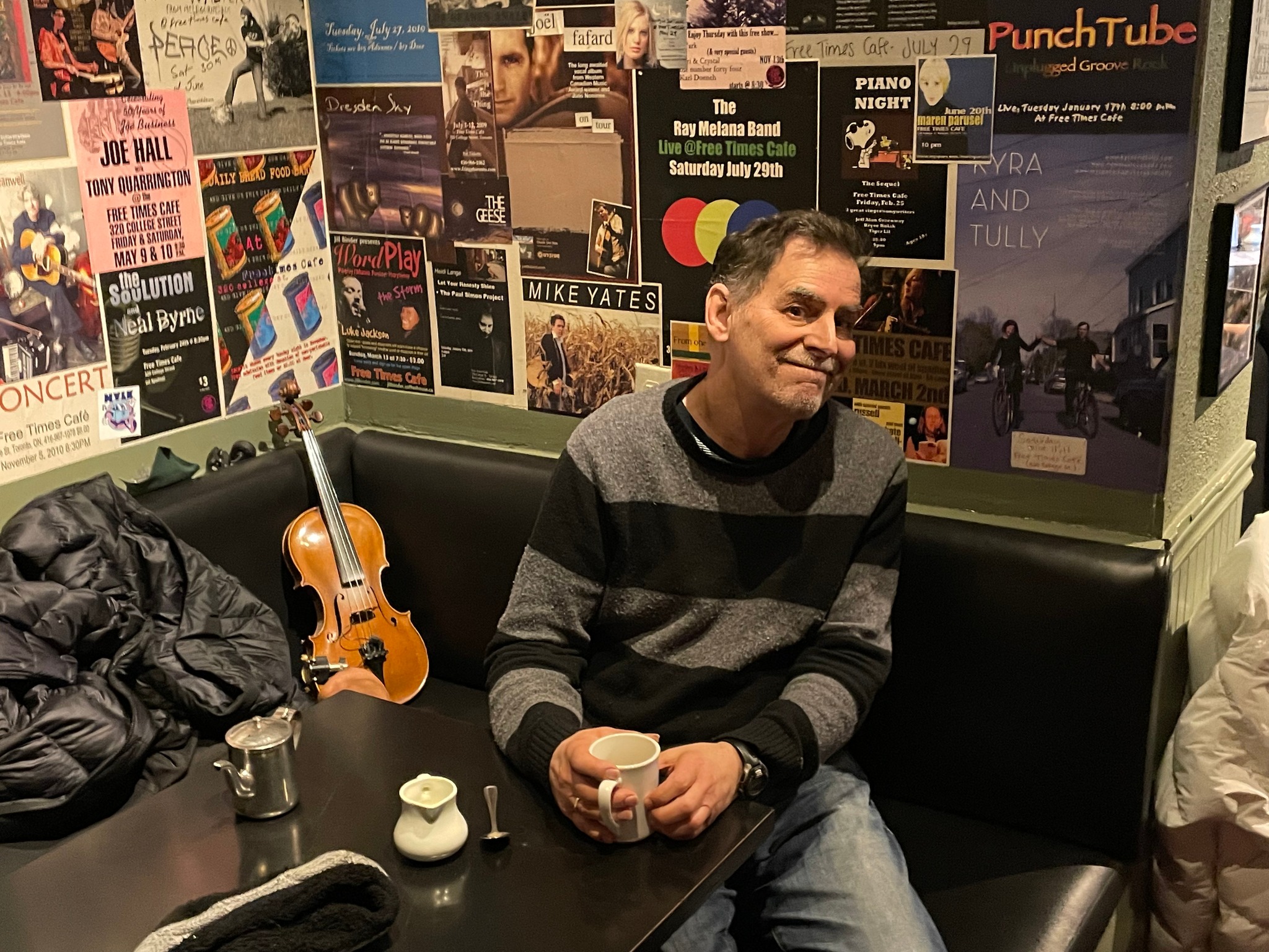 Clockwise from top-left: Jughead (early 90s), at the Free Times (2022), Winterfolk with Wayne and Bob (2019), w Jughead, at the El Mocambo with Gord’s Acoustic Living Room (2015).