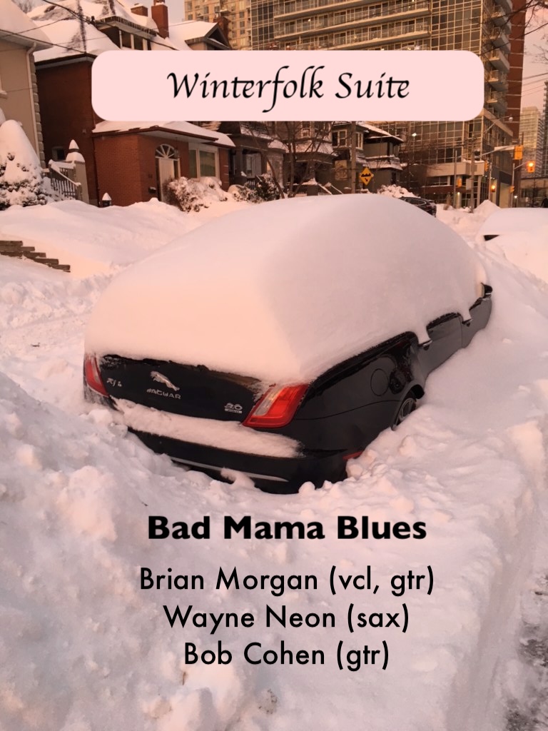 I often open featured sets with this song and describe it as indicative of a recurring theme in my songwriting repertoire: dysfunctional relationships. The ending of this spousal lament, with its grovelling twist of pitch, also tries to capture the specific moment and location of the performance. The accompanying cover photo of the snow-buried automobile says it all. The weekend of Winterfolk 2025 took place during a time of intense snowfall with some scheduled performers unable to get into town. There was still lots of great music to be enjoyed for those who attended. Speaking of, here are two great blues solos by Wayne Neon on sax and Bob Cohen on guitar.